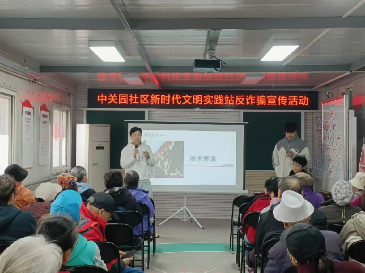 在中关园社区,小组成员们吸收了前一次宣讲的经验,对讲座模式进行了创新。宣讲以魔术表演作为开场,李奎良同学通过精彩的魔术表演揭开了本次宣讲的帷幕。魔术表演深受在场观众的喜爱,取得了非常好的效果。表演过后,李奎良同学将魔术与本次宣讲主题相结合,认为魔术师精心设计的魔术虽能迷惑眼睛,却难以骗走大家的信任,因为大家知道魔术是假的。然而不法分子的骗局却能轻易骗取信任,他们专挑人们防备最弱之时下手。所以我们需要加强反诈意识,让骗子无从下手。