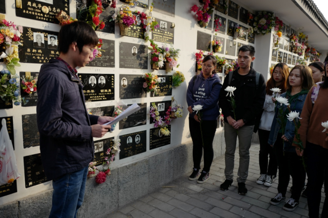 发言完毕后,老师和同学们在王重民先生墓前鞠躬致意,依次献上手中鲜花,向王重民先生表达崇高的敬意。