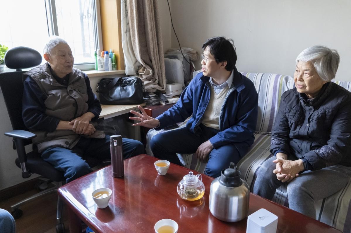 图 2 系党委书记李胜与退休教授张文儒、关烨第夫妇亲切交流