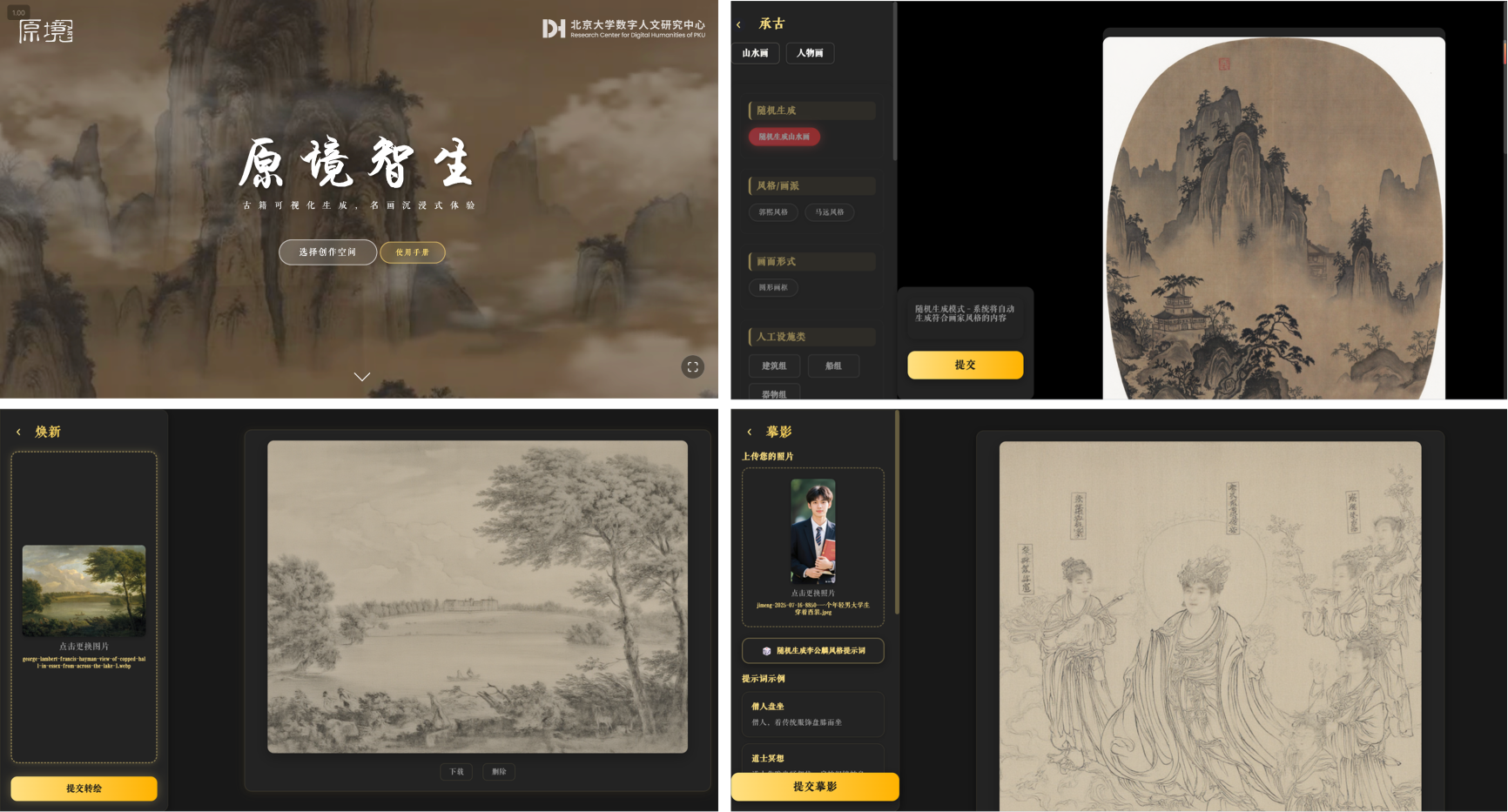 《原境智生》平台体现了北京大学数字人文研究中心在跨学科合作与智能人文应用领域的长期积累。该中心作为北京大学校级跨学科研究平台,致力于古籍资源的智能开发与利用,并牵头组织“古籍智能”专业委员会,旨在以技术赋能人文研究、以人文引领技术发展。本次获奖项目正是这一理念的典型实践:团队利用前沿人工智能生成内容(AIGC)技术,对宋代白描艺术进行深度学习与再现,训练出能够生成宋代风格山水画和人物画的专用模型,只需输入简短的文字或选择相关要素,便能生成栩栩如生的白描画卷。同时,团队创新性地集成“人脸入画”与“风格转绘”等功能。用户可将自己的面部特征融入画面之中,或将其他风格的图像转换为宋代白描风格。该项目以多模态互动方式重构传统文化体验场景,旨在通过技术助力公众与传统对话,推动古籍与艺术资源的智能化、社会化服务。