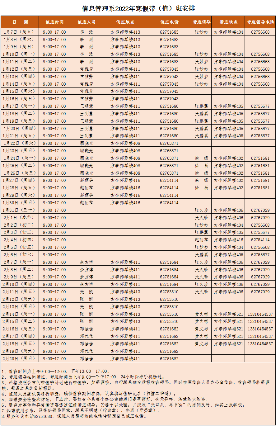 信息管理系2022年寒假带(值)班安排