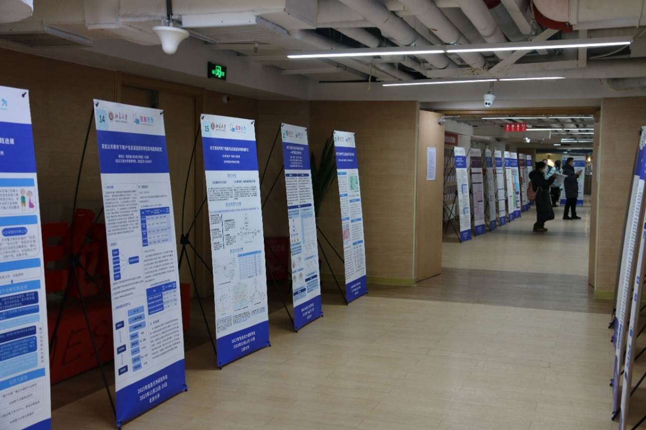 12月24日下午1点至2点,海报展示环节于北京大学全球大学生创新创业中心举行,32个学术团队通过学术海报的形式展示了最新研究成果。这些海报的研究主题广泛、研究对象多元,关注了人工智能、社交媒体、公共图书馆、政务平台等多个场景以及儿童、青少年、大学生、老年人等多类群体。海报团队与参会人员进行了热烈交流,为大家呈现了一场精彩纷呈的学术盛宴。