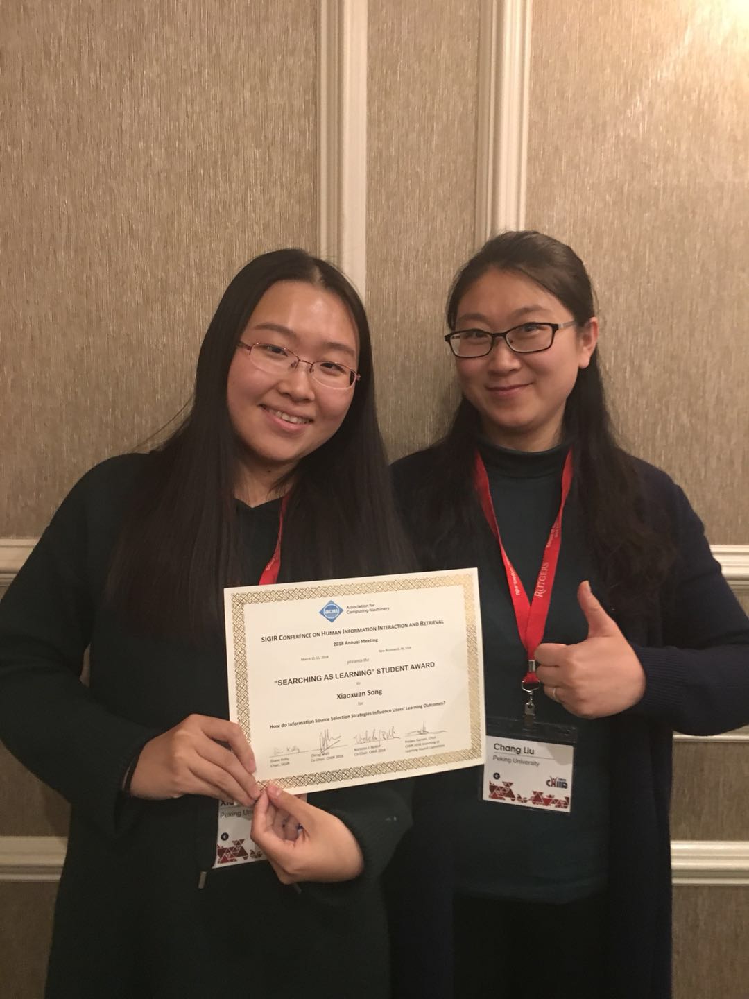 在今年的CHIIR会议中,我系刘畅老师项目组有两篇论文被录用和展示,分别是刘畅老师和宋筱璇同学的论文《How do Information Source Selection Strategies Influence Users’ Learning Outcomes?》;刘畅老师、闫增旺同学与美国J. Liu教授合作的论文《Personalizing Information Retrieval Using Search Behaviors and Time Constraint》。其中,宋筱璇同学的论文获得了会议颁发的“Search as Learning”主题最佳学生论文奖。“Search as Learning”(学习型搜索)是近年来交互式信息检索领域的研究热点,这次获奖也说明我系师生的研究得到了国际同行的认可,并站在了世界前列。