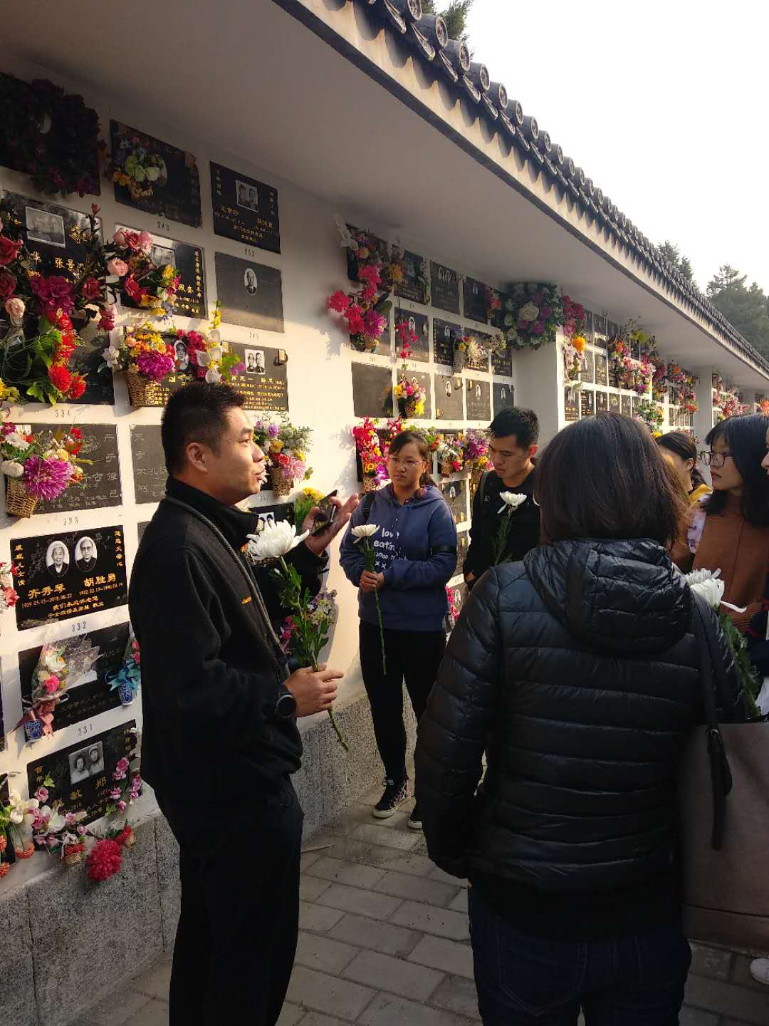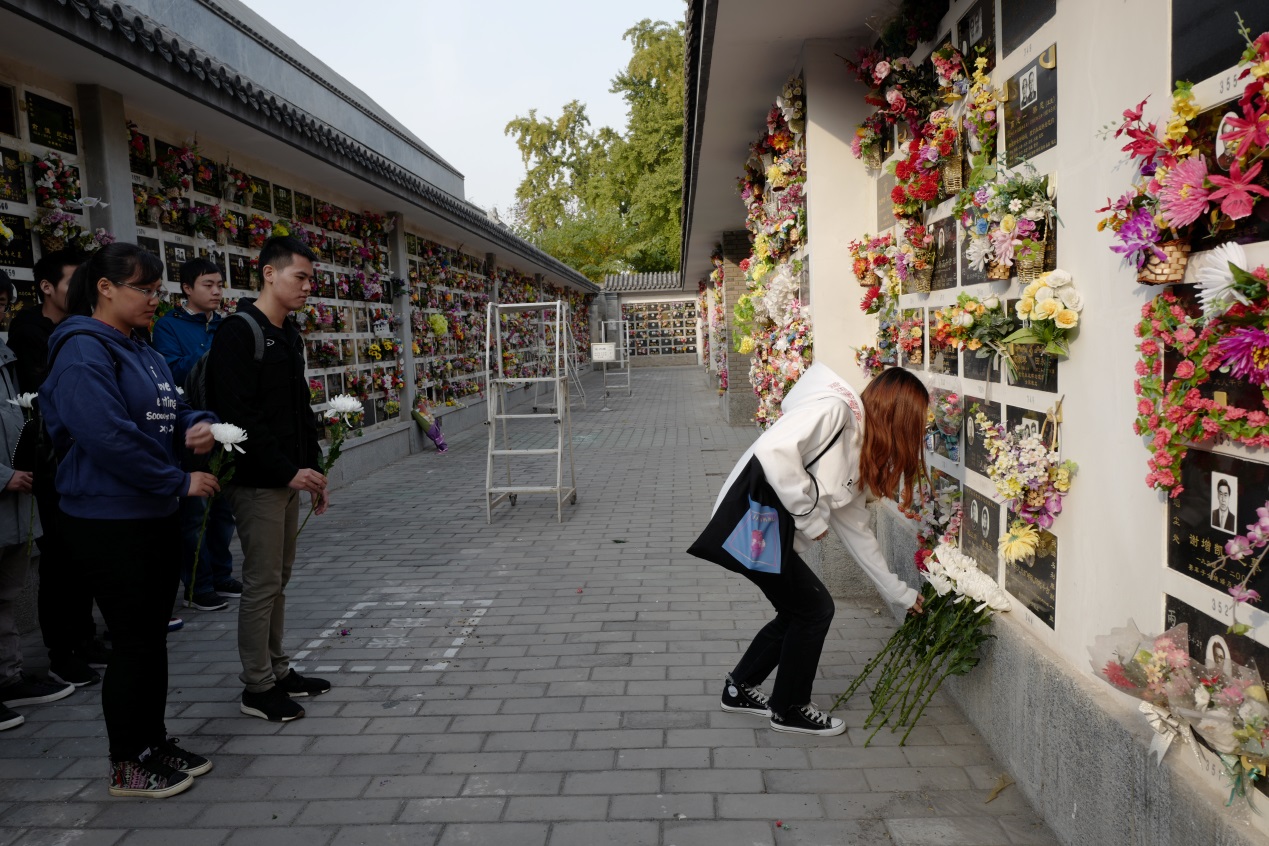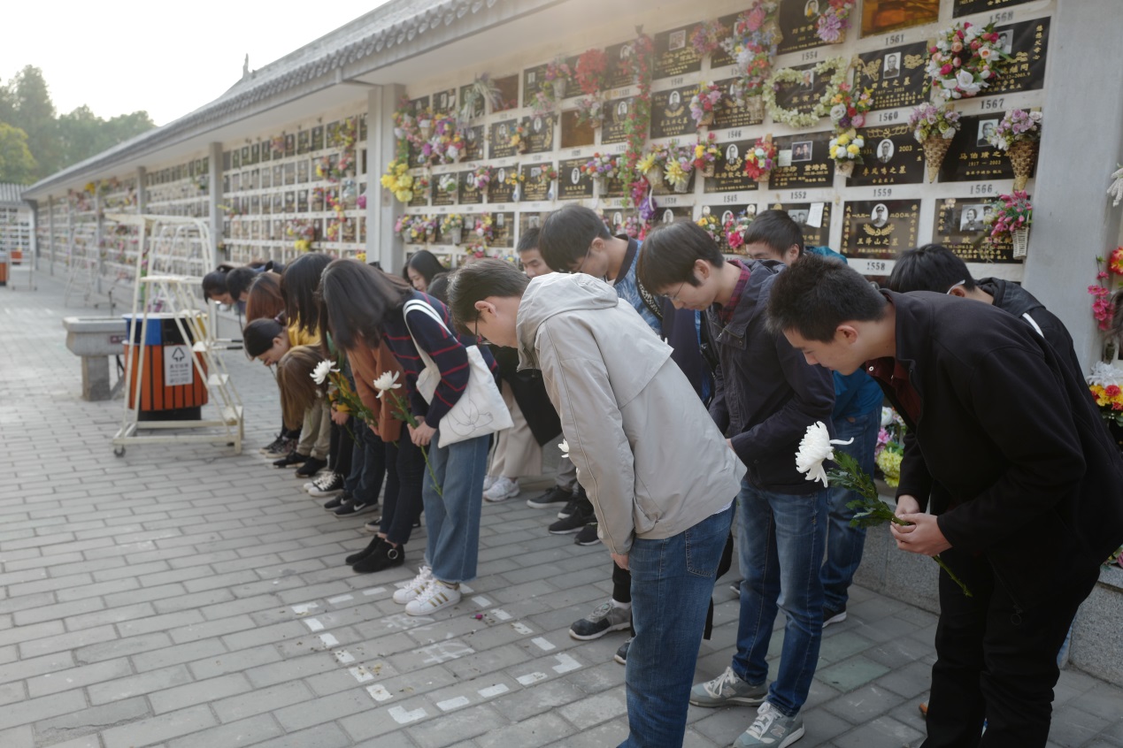 发言完毕后,老师和同学们在王重民先生墓前鞠躬致意,依次献上手中鲜花,向王重民先生表达崇高的敬意。