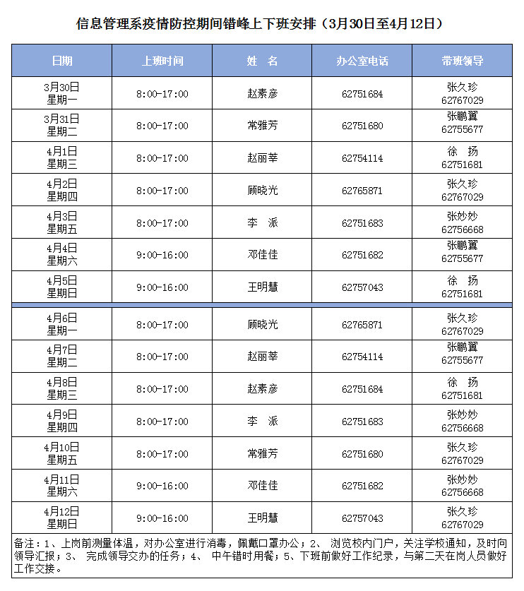 信息管理系疫情防控期间错峰上下班安排(3月30日至4月12日)